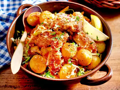 Wash parsley, shake dry and chop finely. Mix cabbage, carrots, dumplings, 3/4 of the parsley and vinaigrette. Arrange in a bowl with the chicken strips, sprinkle remaining parsley and garnish with lemon slices as desired. Pretzels taste good with it.