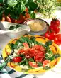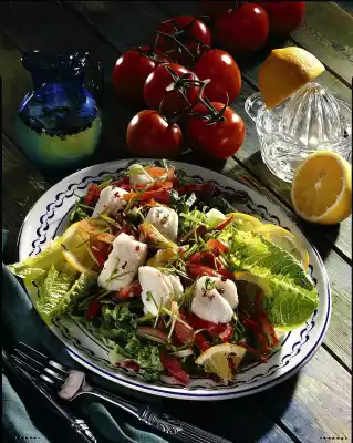 Mix vinegar, rest of the juice, salt, pink pepper, sugar and oil. Mix with the salad ingredients. Arrange fish on salad strips and leaves. Garnish with lemon slices