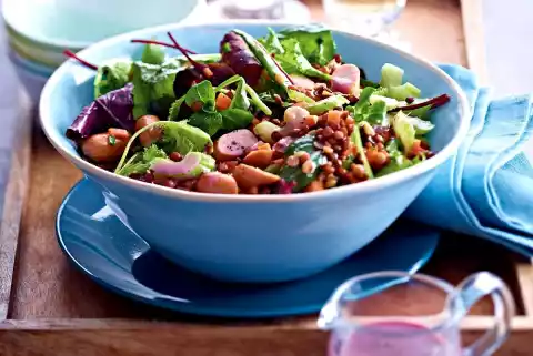 Mix warm lentil vegetables, sausages, salad, chives and dressing.