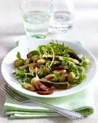 Add the beans and olives to the pan and season with salt and pepper to taste. Remove the pan from the stove. Wash the rocket, shake dry and cut into small pieces depending on size. Mix lukewarm okra pan and rocket and arrange on plates.