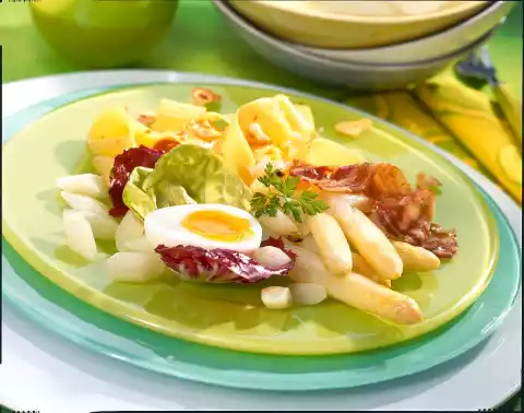 Fry bacon in a pan without fat for about 1 minute of both. Take out and put aside. Roast bread crumbs and garlic in the frying fat until golden brown. Drain the noodles, drain and add to the bread crumbs. Drizzle 4 tablespoons of asparagus vinaigrette over the pasta and toss. Halve the eggs. Arrange asparagus with eggs, pasta salad and breakfast bacon on plates. Garnish as desired with leaf salads and herbs