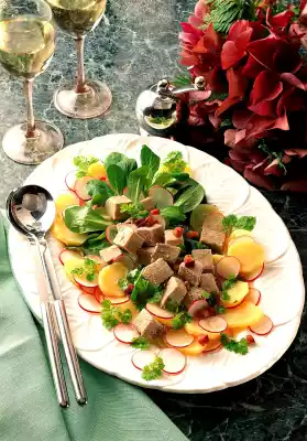 Take the meat out of the broth, remove from the bone and dice. Arrange loosely mixed with the prepared ingredients on a large plate. Pour over with warm bacon sauce.