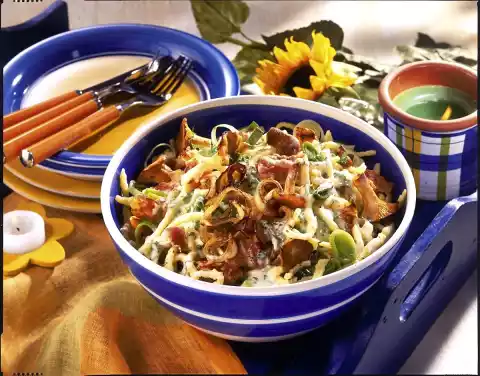 Mix oil, vinegar and cream. Add parsley. Season with salt, pepper and sugar. Chop bacon coarsely. Mix warm spaetzle with warm vegetables, bacon and the parsley-cream vinaigrette. Serve still warm.