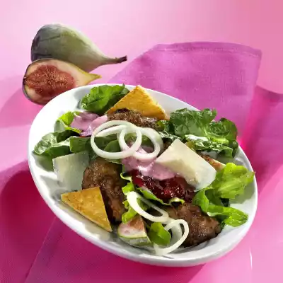 Clean and wash the spinach. Peel onion, cut into rings. Cut figs into quarters. Mix prepared ingredients and season with vinegar. Wash liver, dab dry and turn lightly in flour. Cut toast bread into triangles. Melt 3 g fat.