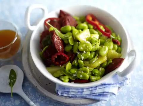 Wash sage, dab dry and pluck leaves from the stems. Coarsely chop larger leaves. Add the beans, peppers and sage to the pan and continue frying for 1-2 minutes. Deglaze with vinegar, stir in 3 tablespoons of olive oil and toss briefly.