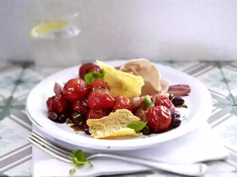 Heat oil in a pan. Fry the shallots and tomatoes for 3-4 minutes. Wash basil, shake dry and chop leaves of 3 stems coarsely. Deglaze tomatoes with vinegar and simmer for about 1 minute. Add honey, chopped basil and olives and season with salt and pepper. Let the tomatoes cool down a little, then arrange them together with Parma ham and Parmesan chips and garnish with basil leaves