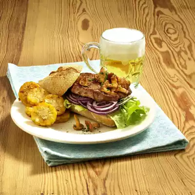 Season with salt and pepper. Keep warm. Wash the meat and pat dry. Add 1 tablespoon of clarified butter to the pan. Fry the meat for 3-4 minutes on each side. Peel onions and cut into fine rings. Clean, wash and pat dry the salad. Cut the bread roll once horizontally. Cover the lower half of the roll with salad, onion rings, meat and mushrooms. Arrange on plates with upper roll half and corn slices.