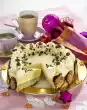 Whip 250 g of cream until stiff, allowing the cream firmer to trickle in. Remove the cake from the ring. Spread the edge of the cake with about half of the cream. Pull a cake comb through the cream. Pour the rest of the cream into the middle of the cake, spread a little. Put the couverture in a disposable piping bag, cut off a small corner. Decorate the cake with chocolate strips and gold and silver beads. Keep cold until serving