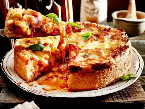 Preheat oven (electric cooker: 250 °C/circulating air: 225 °C/gas: see manufacturer). Cut mozzarella into slices. Grate Gouda. Spread the BBQ sauce on the dough base. Spread the corn, meat and bacon slices evenly on top.