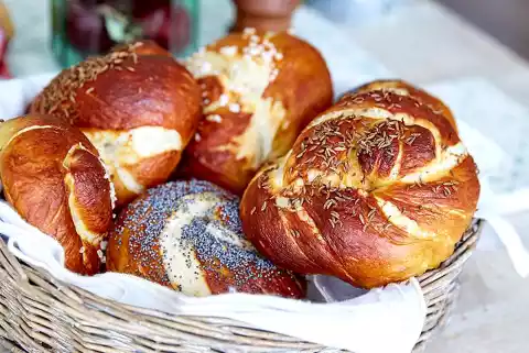 Bring approx. 1 l water, baking soda and 1 teaspoon salt to the boil in a small pot. Put the knots one by one with the upper side into the lye and let it soak for about 30 seconds. Turn around and let it stand for another 10 seconds. Lift out with a skimmer, drain well and place on the baking paper. Spread all the knots with milk and sprinkle with sea salt, caraway and poppy seeds if desired. Bake in a preheated oven (electric cooker: 200 °C/circulating air: 180 °C/gas: see manufacturer) for approx. 15 minutes.
