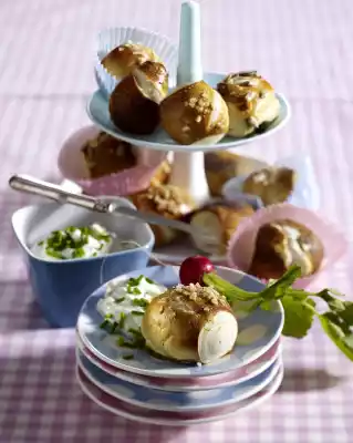 For the dip, peel and finely dice the onion. Stir curd, cream cheese and 6-7 tablespoons of milk until smooth. Wash the chives, shake dry and cut into fine rolls. Put 1 teaspoon aside for decoration, stir the remaining chives into the quark.