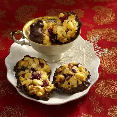 Bring butter, cream, sugar and syrup to the boil in a saucepan while stirring. Chop cranberries and macadamia. Add the flaked almonds, macadamia and cranberries to the fat-sugar mixture and simmer over a low heat for about 2 minutes, stirring occasionally. Stir in flour. Let rest for about 15 minutes. Line two baking trays with baking paper.