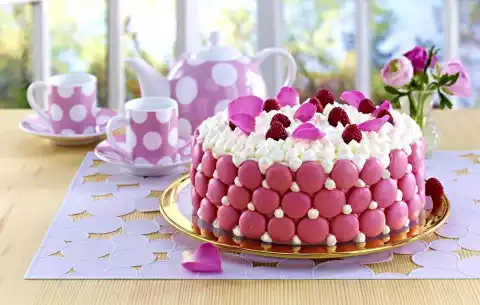 Mix 1 sachet of cream firming agent and 25 g sugar. Whip 400 g cream until stiff, allowing the sugar mixture to trickle in. Remove the cake from the ring, spread the cream all around the cake, chill for about 10 minutes. Whip 200 g cream until stiff, fill into a piping bag with small perforated spout. Remove the macarons from the baking paper. Press the macarons in 3 rings onto the edge of the cake, offsetting each row by 1/2 macaron. Pour some cream in very small tuffs between the macarons, leaving every 2nd gap free. Spray the rest of the cream in very small tuffs onto the cake. Decorate the cake with raspberries and rose petals