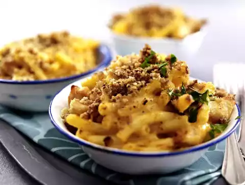 Pour the pasta into a sieve, rinse and drain. Crumble the pretzel slices between your fingers over a small bowl and knead with 1 tablespoon butter. Mix the noodles, meat and sauce and put them into the greased forms or baking dish.