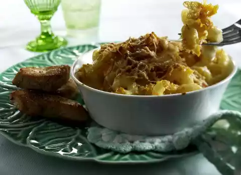 Stir the cheese, except for 25 g Parmesan, into the béchamel sauce and let it melt. Mix the pasta with the sauce and fill into small casseroles. Crumble the cornflakes slightly and sprinkle them over the pasta with 25 g Parmesan cheese.