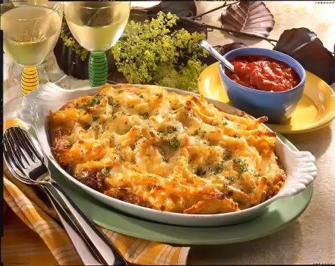 Let the sauce simmer at medium heat for about 4 minutes. Wash parsley, dab dry and chop finely. Serve the casserole sprinkled with parsley. Serve tomato sauce extra.