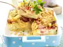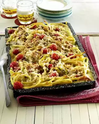 In the meantime cut the ham into short strips. Clean and wash spring onions and cut into rings. Wash the tomatoes. Pour pasta into a sieve, put it back into the pot and add spring onions, tomatoes, ham and sauce and fold in. Put them into a greased deep baking tray. Crumble the bread finely in the universal chopper. Spread the hazelnut flakes, bread and 75 g fat in flakes on the casserole. Bake in the preheated oven (electric cooker: 200 °C/ convection oven: 175 °C/ gas: level 3) for approx. 40 minutes