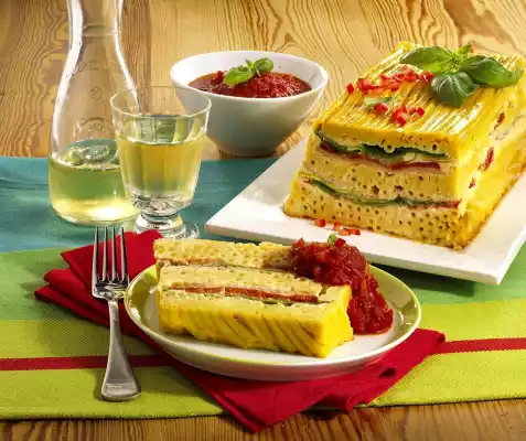 Cook in the preheated oven (electric cooker: 175 °C/ convection oven: 150 °C/ gas: level 2) for approx. 45 minutes. In the meantime, peel onion and garlic and dice finely. Heat the oil in a pot. Sauté onion and garlic in it until transparent. Dust with flour and sauté. Add the tomatoes while stirring. Season to taste with salt, pepper and sugar. Take out the casserole and turn out on a plate. Remove seeds from 1/2 tomato and dice finely. Sprinkle over the casserole. Garnish with basil. Cut the casserole into slices and serve with tomato sauce
