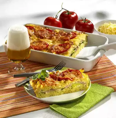 Cover pasta with tomato slices and sprinkle with cheese. Place the casserole dish in the preheated oven (electric cooker: 175 °C/ convection oven: 150 °C/ gas: level 2) and let the egg milk set for about 30 minutes.