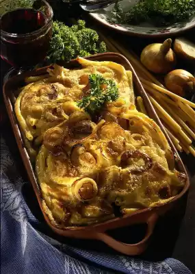 Cover and stew for 15-20 minutes. Wash the thyme, dab dry and chop finely, except for 2 pieces. Mix eggs, milk, thyme, salt and pepper. Layer the macaroni, drained savoy cabbage and salmon ham in a greased casserole dish. Pour over egg milk and sprinkle with parmesan. Bake in the preheated oven (electric: 200 °C/ gas: level 3) for about 45 minutes. Serve sprinkled with remaining thyme leaves