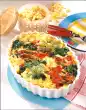 Fry onions in hot oil until translucent. Add ham and tomato slices (put some aside for garnishing) and fry briefly. Wash the chives and dab dry. Place half of the macaroni and 1/3 of the chives in a circle in a greased, ovenproof casserole dish (approx. 25 cm Ø).