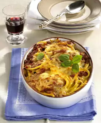Place the pasta and bolognese in an ovenproof casserole dish and sprinkle with cheese. Bake in the preheated oven (electric cooker: 200 °C/ convection oven: 175 °C/ gas: level 3) for approx. 30 minutes. Remove, garnish with basil and serve immediately.