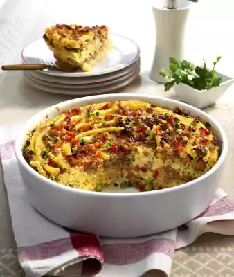 Season with salt, pepper and nutmeg. Grate cheese. Layer the pasta, minced meat mixture and cheese in layers in a greased springform pan (24 cm Ø) carefully wrapped in aluminium foil or in a high casserole dish which is also greased. Place the noodles with the rounding and finish with cheese. Drizzle egg milk over the pasta. Cook in the preheated oven (electric cooker: 200 °C/ convection oven: 175 °C/ gas: level 3) for 40-45 minutes. Let the cake rest in the springform pan for a while, then carefully remove from the pan