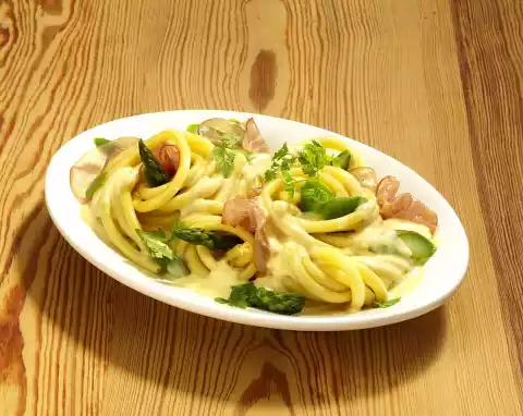 Heat 1/2 teaspoon fat in a pot and sauté the onion cubes in it until translucent. Stir in 100 g cream and simmer for 2 minutes. Mix 50 g cream and egg yolk. Remove the pot from the heat and stir in the egg yolk cream (if necessary, warm up again, but do not boil!) Season the sauce with salt and pepper and add the asparagus. Drain the noodles. Arrange noodles with the sauce and salmon ham and garnish with chervil