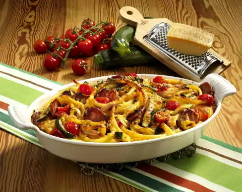 Beat the eggs, milk, cheese and thyme. Season with salt, pepper and nutmeg. Mix the pasta, sausage and vegetables and place in a greased, ovenproof dish (1.4 litres capacity). Pour egg-milk evenly over the pasta. Bake in a preheated oven (electric cooker: 175 °C/ convection oven: 150 °C/ gas: level 2) for approx. 45 minutes. Garnish with thyme