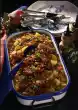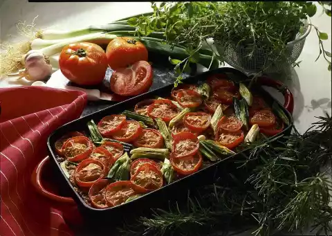 Cook the macaroni in boiling salted water for 10-12 minutes. Peel and finely dice onions. Wash herbs, drain and chop finely. Dice olives finely as well. Knead minced meat, onions, oat flakes, eggs, 1/2 cup crème fraîche, herbs and olives. Season to taste with salt, pepper and nutmeg. Heat the oil and fry the minced meat in portions. Remove and put aside. Peel the garlic, press it through a garlic press or chop it finely and fry it in the frying fat until transparent. Deglaze with wine, stir in strained tomatoes and the remaining crème fraîche. Stir in the sauce thickener and bring to the boil. Season with salt, some sugar and pepper. Mix with the minced meat. Drain the macaroni on a sieve and let it drain. Clean and wash the spring onions and tomatoes. Onions in approx. 5 cm long pieces, tomatoes in slices. Alternately layer macaroni and lamb mince sauce in a greased casserole dish. Finish with minced meat. Spread the tomatoes and spring onions on top, brush with oil and bake in a preheated oven (electric range: 200 °C/ gas: level 3) for 40-45 minutes