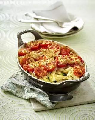 Spread the pasta in a large greased casserole dish. Pour the sauce over it. Place tomato slices on top. Season with salt and pepper. Grate the parmesan and mix with the breadcrumbs. Sprinkle over the tomatoes.