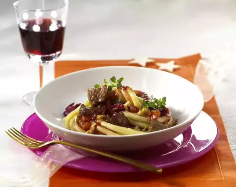 Deglaze with red wine and simmer for about 5 minutes. Prepare macaroni in boiling salted water according to package instructions. Clean and wash the radicchio and cut it roughly into pieces. Coarsely chop the walnuts.
