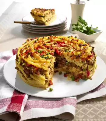 Layer pasta and minced meat mass in the form. Pour egg milk over it and sprinkle with cheese. Bake in the preheated oven (electric cooker: 200 °C/circulating air: 175 °C/gas: level 3) for 40-45 minutes. Let the macaroni cake rest in the mould for a while, then carefully remove it