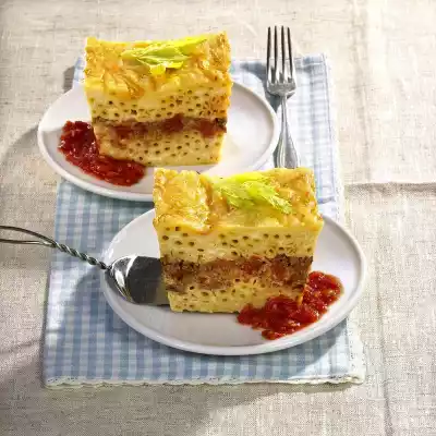 Deglaze with broth and cream while stirring constantly and bring to the boil. Season with salt and pepper. Grease a box form (1 1/4 litre capacity; 25 cm long). Spread some sauce thinly on the bottom. Spread half of the pasta evenly on top. Add half of the sauce. Spread the minced meat mixture evenly on the pasta. Add the remaining pasta and pour the rest of the sauce over it. Grate cheese and spread evenly on the casserole. Bake in the preheated oven (electric cooker: 200 °C/ convection oven: 175 °C /gas mark 3) for 40-45 minutes. In the meantime, finely dice onion and 1 clove of garlic. Heat 1 tablespoon of oil in a small pot. Sauté the garlic and onion until transparent. Add the remaining tomatoes and chop a little. Season with salt, pepper and sugar. Serve casserole and sauce together