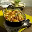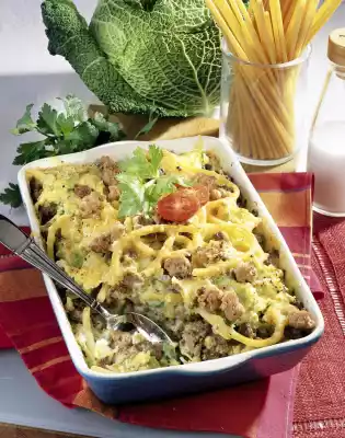 Dust with flour, sauté briefly and deglaze with stock and milk. Bring to the boil and season with salt, pepper and nutmeg. Take out and put aside. Heat oil in a pan and fry the minced meat in it until crumbly. Season with salt and pepper. Take it out and put it aside. Grease an ovenproof dish and line it with half the macaroni. Add half of the savoy cabbage and spread half of the minced meat on top. Layer the remaining macaroni, savoy cabbage and minced meat. Grate the gouda coarsely, sprinkle over it.