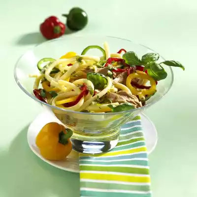 Cook the pasta in boiling salted water according to the instructions on the packet. Clean and wash the peppers and cut them into thin rings. Wash the basil, dab dry, put something aside for garnishing.