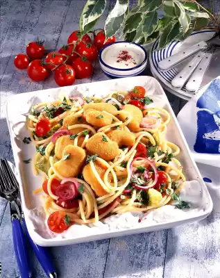 Pour the pasta onto a sieve, quench, drain and let it cool down. In the meantime, place dippers on a baking tray and bake in a preheated oven (electric range: 200 °C/ gas: level 3) for 10-12 minutes. Mix vinegar, salt, sugar and pepper. Whip the oil into the dip. Peel garlic and chop finely. Mix yoghurt, salad cream and garlic. Season to taste with salt and pepper. Mix noodles, onions, cherry tomatoes, cucumber and rocket. Pour vinaigrette over it.