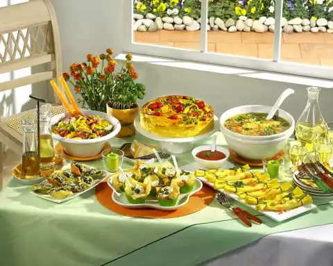 Season with salt, pepper and nutmeg. Grease an ovenproof dish (26 cm Ø). Layer macaroni, ham cubes and vegetables in it in a circle. Pour egg milk evenly over it. Bake in the preheated oven (electric cooker: 200 °C/ convection oven: 175 °C/ gas: level 3) for 35-40 minutes