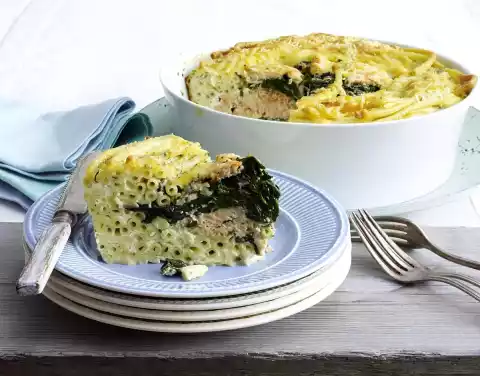 Lay salmon and spinach alternately in the middle. Add the remaining noodles to the edge. Pour the sour cream and egg milk over everything. Mix both cheeses with breadcrumbs and sprinkle over the casserole.