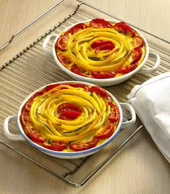 Season with salt, pepper and nutmeg. Grease 2 ovenproof casseroles (20 cm Ø). Layer 1/4 of each of the macaroni, zucchini and tomatoes, repeat the process. Pour egg milk into the casseroles. Cook in the preheated oven (electric cooker: 175 °C/ convection oven: 150 °C/ gas: level 2) for approx. 45 minutes. Remove and let cool slightly before serving