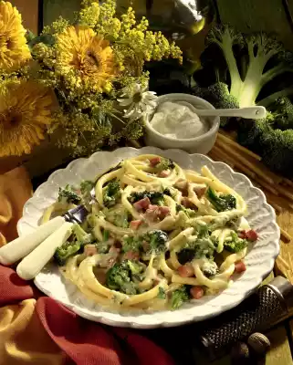 Clean and wash the broccoli and cut it into small florets. Bring the broth to the boil, add the broccoli and steam covered for about 5 minutes. In the meantime peel and dice the onion. Dice ham as well. Pour broccoli on a sieve and collect the broth. Cook macaroni in plenty of boiling salted water for 8-10 minutes.