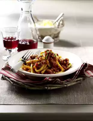 Mix the bacon with the sauce. Season again with salt, pepper, sugar, paprika and cayenne pepper. Pour the noodles into a sieve, quench briefly, drain. Mix the noodles into the minced sauce, heat up again and arrange on plates sprinkled with parsley.