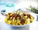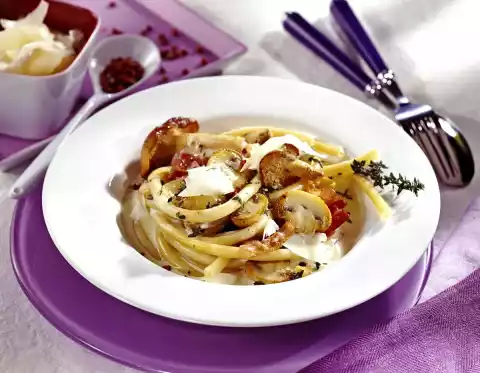 Wash thyme, dab dry and, except for something to garnish, peel the leaves from the stems or chop the thyme leaves. Fry the bacon in a pan without fat until crispy. Add the onion and fry. Remove everything. Add oil to the frying fat. Fry the mushrooms for about 5 minutes while turning them. Season with salt and pepper. Dust the mushrooms with flour and sauté briefly. Deglaze with cognac, bring to the boil briefly. Then deglaze 3/8 litres of water and cream. Bring to the boil, stir in broth and simmer for about 5 minutes. Stir in thyme. Add bacon-onion mixture to the sauce.