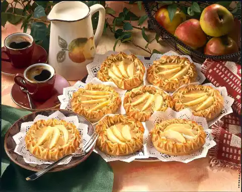 Mix mascarpone, yoghurt, sugar, cinnamon and sauce powder. Wash, peel and quarter the apple and cut out the core. Cut the apple quarters into slices. Roll out short pastry on a floured work surface and cut out 8 circles (9-10 cm Ø). Place on a baking tray lined with baking paper and bake in a preheated oven (electric range: 200 °C/ gas: level 3) for about 7 minutes. Spray a dotted edge onto the pre-baked, hot cookies with the macaroon mixture. Fill with mascarpone cream and spread the apple slices on top. Bake in the preheated oven (electric: 200 °C / gas: level 3) for 15-20 minutes. Heat up the apricot jam, pass through a sieve and coat the finished pieces with it.