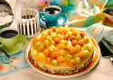 Roll out on a springform pan (22 cm Ø), prick several times with a fork. Bake in a preheated oven (electric: 175°C/ gas: level 2) for 15-20 minutes. For the macaroon rings, sieve icing sugar and knead with the raw marzipan mixture, egg yolk and lemon zest.