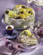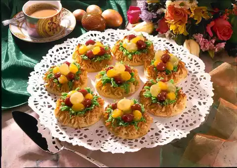 Cut the fat into cubes and knead together with flour, sugar, egg yolk, lemon peel, salt and approx. 2 tablespoons of ice water to a smooth shortcrust pastry. Wrap in foil and chill for about 30 minutes. In the meantime, dice marzipan for the macaroon mixture. Sift icing sugar and flour over it, add egg white and knead. Fill into a piping bag with star-shaped spout. Roll out the short pastry thinly on a floured work surface and cut out 8 circles (8-9 cm Ø). Place on a baking tray lined with baking paper. Prick with a fork and brush with condensed milk. Spray macaroon mixture as tuffs onto the edges. Bake in a preheated oven (electric: 175°C/ gas: level 2) for 15-20 minutes. Let them cool down. Knead marzipan and icing sugar and colour green with food colouring. Press the marzipan in portions through a garlic press. Line nests with it. Drain cherries and peaches well. Wash the grapes, dab dry. Cut out small fruit balls from the peaches with a ball cutter. Fill nests with cherries, peach and grapes. Measure 1/8 litre peach juice, take 2-3 tablespoons of it and mix it with the cornflour. Bring the rest of the juice to the boil, add the cornstarch while stirring. Bring to the boil again briefly and allow to cool slightly. Spread the icing over the fruit. Results in 8 nests