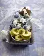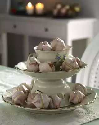 Continue beating until the sugar has dissolved and a shiny mass has formed. Loosely fold the raspberry puree into the mixture and fill into a piping bag with a star-shaped spout. Line a baking tray with baking paper. Spray approx. 44 small tuffs from the beaten egg white mixture onto it. Bake in a preheated oven (electric cooker: 125 °C/ convection oven: 100 °C/ gas: not suitable) for approx. 1 hour. Then reduce the oven temperature by 25° C (electric oven: 100 °C/ convection oven: 75 °C/ gas: not suitable) and bake for approx. 1 further hour. Turn off the oven and let the tuffs cool down for about 1 1/2 hours. Roughly chop the chocolate and melt in a bowl over a warm water bath. Stir in butter. Remove the meringue tuffs from the baking paper. Pour white chocolate cream on half of the tuffs on the underside. Place other meringue tuffs with the underside on top.