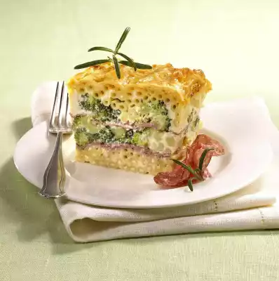 Prepare the pasta in salted water according to the instructions on the packet. Clean and wash the broccoli and cut into florets. Blanch in boiling salted water for 2-3 minutes. Drain. Layer the pasta, salami and broccoli in a greased box form. Mix eggs, cream, milk, mustard, salt and pepper and pour over the casserole.