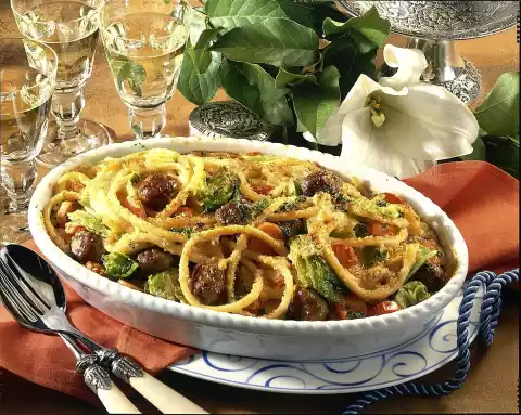 Cook vegetables in boiling salted water for about 8 minutes and drain. Press the sausage mixture out of the skin, form into dumplings and fry in hot oil while turning for about 3 minutes. Pour prepared ingredients into an ovenproof dish.