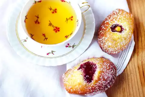 Remove from the mould and let it cool down briefly on a cake rack. In the meantime, wash and dry the tin and bake the remaining madeleines in the same way. Pour 1 teaspoon of lemon curd into each madeleine with the piping bag.
